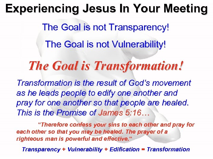 Experiencing Jesus In Your Meeting The Goal is not Transparency! The Goal is not Vulnerability! The Goal is Transformation! Transformation is the result of God’s movement as he leads people to edify one another and pray for one another so that people are healed. This is the Promise of James 5: 16… “Therefore confess your sins to each other and pray for each other so that you may be healed. The prayer of a righteous man is powerful and effective. “ Transparency + Vulnerability + Edification = Transformation