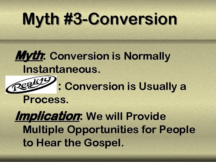 Myth #3 -Conversion Myth: Conversion is Normally Instantaneous. Reality : Conversion is Usually a Process. Implication: We will Provide Multiple Opportunities for People to Hear the Gospel.