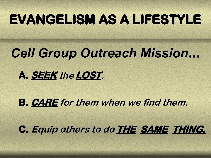EVANGELISM AS A LIFESTYLE Cell Group Outreach Mission… A. SEEK the LOST. B. CARE for them when we find them. C. Equip others to do THE SAME THING.