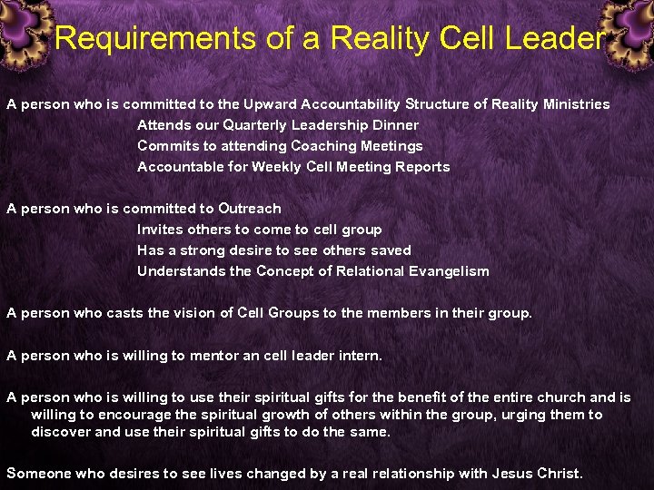 Requirements of a Reality Cell Leader A person who is committed to the Upward Accountability Structure of Reality Ministries Attends our Quarterly Leadership Dinner Commits to attending Coaching Meetings Accountable for Weekly Cell Meeting Reports A person who is committed to Outreach Invites others to come to cell group Has a strong desire to see others saved Understands the Concept of Relational Evangelism A person who casts the vision of Cell Groups to the members in their group. A person who is willing to mentor an cell leader intern. A person who is willing to use their spiritual gifts for the benefit of the entire church and is willing to encourage the spiritual growth of others within the group, urging them to discover and use their spiritual gifts to do the same. Someone who desires to see lives changed by a real relationship with Jesus Christ.
