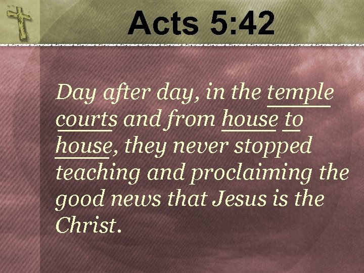Acts 5: 42 Day after day, in the temple courts and from house to house, they never stopped teaching and proclaiming the good news that Jesus is the Christ.