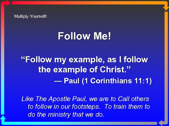 Multiply Yourself! Follow Me! “Follow my example, as I follow the example of Christ. ” — Paul (1 Corinthians 11: 1) Like The Apostle Paul, we are to Call others to follow in our footsteps. To train them to do the ministry that we do.