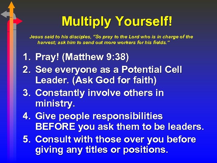 Multiply Yourself! Jesus said to his disciples, “So pray to the Lord who is in charge of the harvest; ask him to send out more workers for his fields. ” 1. Pray! (Matthew 9: 38) 2. See everyone as a Potential Cell Leader. (Ask God for faith) 3. Constantly involve others in ministry. 4. Give people responsibilities BEFORE you ask them to be leaders. 5. Consult with those over you before giving any titles or positions.