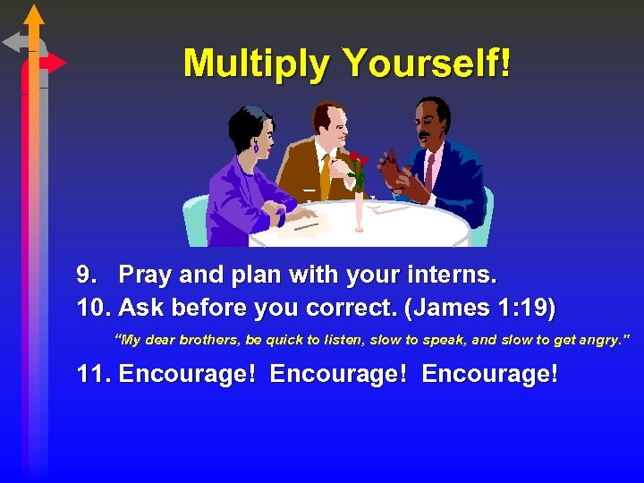Multiply Yourself! 9. Pray and plan with your interns. 10. Ask before you correct. (James 1: 19) “My dear brothers, be quick to listen, slow to speak, and slow to get angry. ” 11. Encourage!