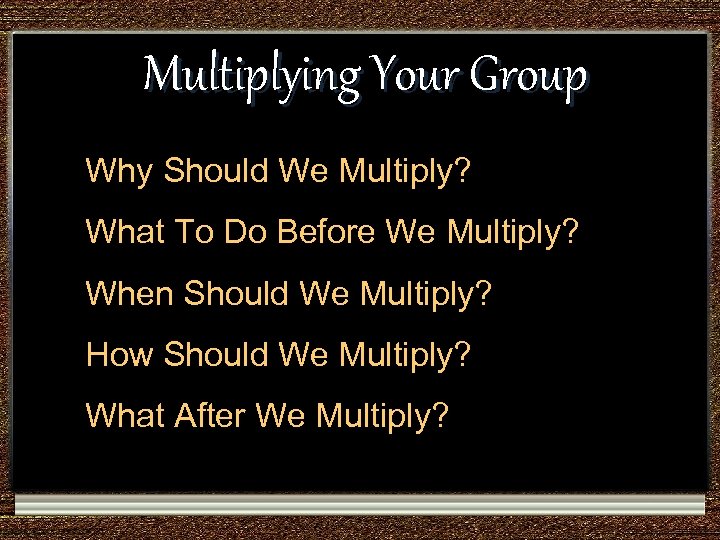 Multiplying Your Group What After We Multiply? Most Important thing to remember!!! We are a Family! This is not a divorce!!! Implement in advance ways that you are going to facilitate community with those in the other group. Focus Events Focus/Share Groups Discipleship Groups Reunion Dinners