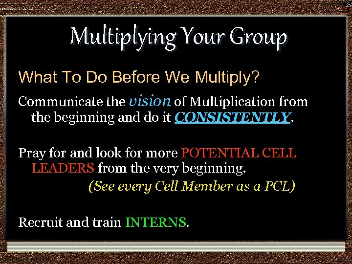 Multiplying Your Group What To Do Before We Multiply? Communicate the vision of Multiplication from the beginning and do it CONSISTENTLY. Pray for and look for more POTENTIAL CELL LEADERS from the very beginning. (See every Cell Member as a PCL) Recruit and train INTERNS.