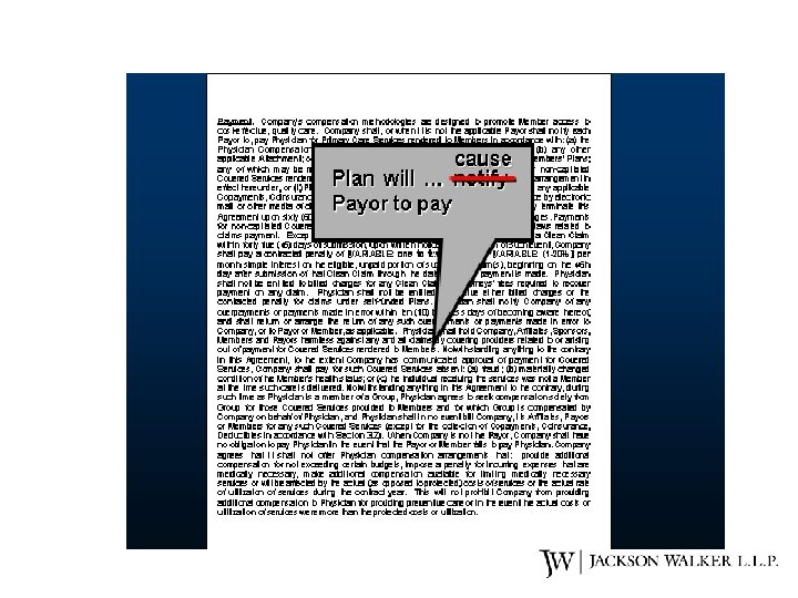 # 2: Payment Clause • “Provider is entitled to receive…” • “Provider will accept payment of claim or penalty…if required by law” • “If Plan is not payor, Plan will notify payor to pay” • “If Plan is not payor, Plan has no obligation to pay” • “Company shall pay, or when it is not the applicable Payor shall cause each Payor to pay, Group for Services rendered to Members in accordance with the fee schedule attached as Exhibit A.