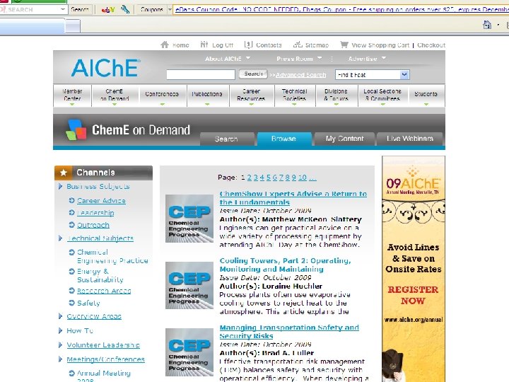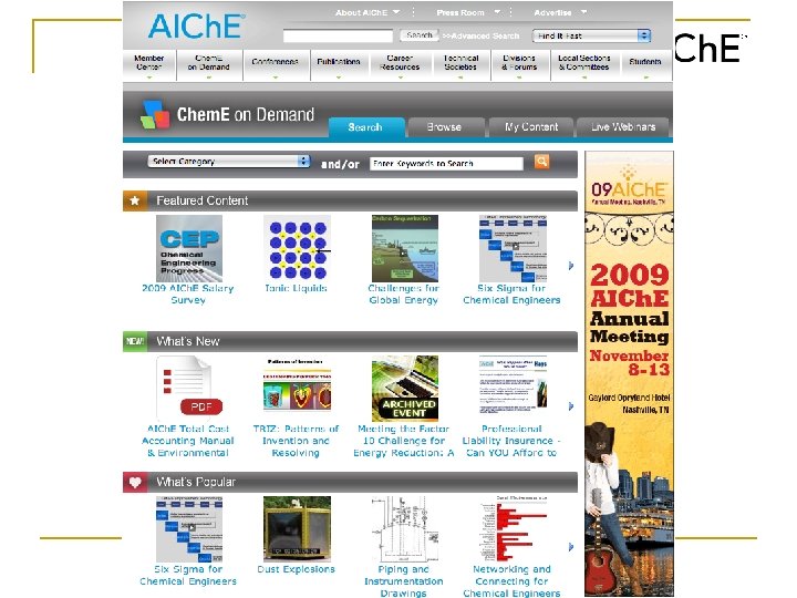WHAT’S NEW? n n 11/2 first publication up on Chem. E on Demand 11/3 600+CEP articles from 2001 on went live Two weeks after Annual, 450 presentations go up After Annual, will be offering professors the opportunity of using archives from Chem. E on Demand in the classroom. A student member will be asked to ‘purchase’ and professor will use for class. Only rule is that ½ the class be student members.