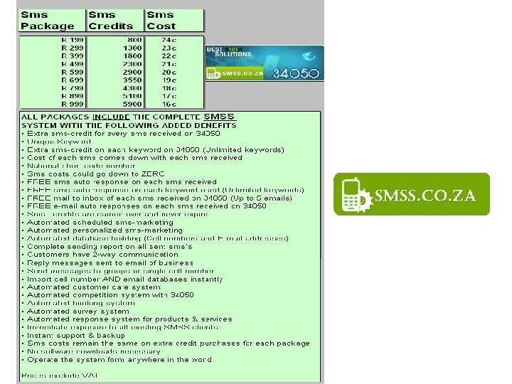 • SMSS offers the LOWEST bulk sms costs in South Africa • Any business have 2 options of making use of SMSS: Option. 1 Send bulk sms’s from only 16 c per sms (Depending on volume, please see pricelist on last slide) (No set-up or monthly fee – Sms credits never expire) Send bulk MMS’s from only R 1. 25 - R 1. 95 for messages up to 100 KB (Minimal set-up fee for creative ad developments) Examples of a MMS message: MMS’s have sound, animation, pictures and videos & could be up to 25 pages! • • • Bulk mms marketing is an excellent way to get a business’s website and products promoted for the following reasons: Cost effective way to send pictures and videos Clients want to receive the messages because they don’t pay for the images Builds client contact Clients often forward the messages to other people and in doing so perform viral marketing without your company paying a cent extra It is more effective than television with the same visual attractiveness and the client can download and view the videos or pictures when he or she is ready Fast delivery of the messages Measurable marketing effort as notification of delivery and opening is received 15 % and more respond within the first day of receiving the message Allows for spontaneous and interactive communication with clients anywhere in the world