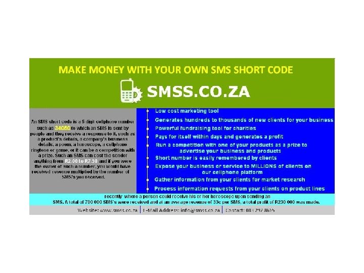 OPTION. 2 Should your business want to make use of the short code system, the following is included Once-off Registration Fee: R 795 +VAT. NO monthly fee ü Free automated sms response to each customer that sends a sms message to the short code number ü Unlimited keywords on the short code, each with it’s own unique auto response message ü Earn between 30 c and R 3 per sms sent to your unique keyword on a 5 -digit short code ü Free email to your inbox of each message received from a customer ü Free sms message notification of each message received to selected cell phone number(s) ü Free automated email to your customer requested via a text message using the short code. ü A secure legal database is created and populated for you ü Sms message scheduler to do automated sms message-marketing. (Scheduling includes days, weeks, months, years) ü 24 -hour access to SMSS website that means you would be in control of your business from anywhere in the world ü Personalized sms message feature for bulk , scheduled and group sms messages. (Automatically taken from database) ü Personalized bulk e-mail feature, taking names automatically from database for personalized email marketing ü Bulk email facility, with automated email database building in groups through the short code ü An EXTRA sms-credit for each message received, to be used for marketing purposes (Can be accumulated & NEVER expires, which translates to FREE sms-marketing) ü Creating of your business on the SMSS platform ü Your own UNIQUE keyword ü Unlimited use of the 5 -digit short code number ü Email set up and registration ü Grouping of different keywords (unlimited) for different departments of your business ü Set up of website complaints, compliments, suggestions or subscriptions ü Set up of promotional platform for your business on SMSS website