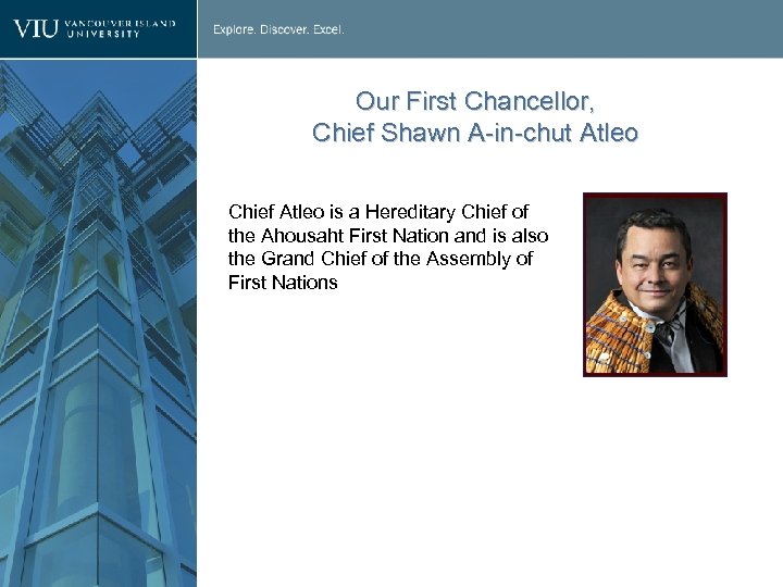 Our First Chancellor, Chief Shawn A-in-chut Atleo Chief Atleo is a Hereditary Chief of the Ahousaht First Nation and is also the Grand Chief of the Assembly of First Nations