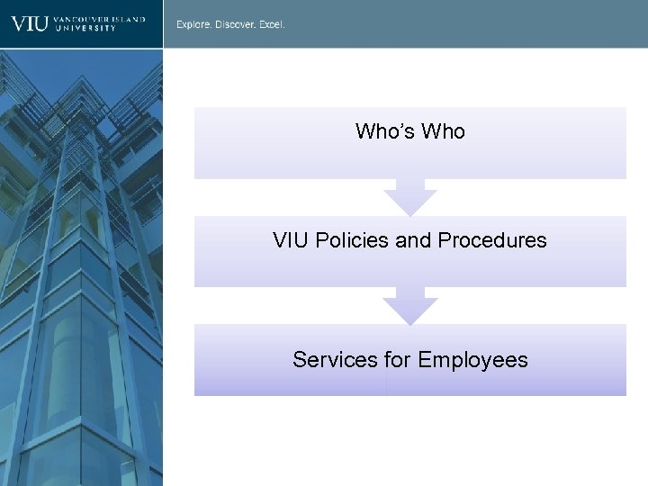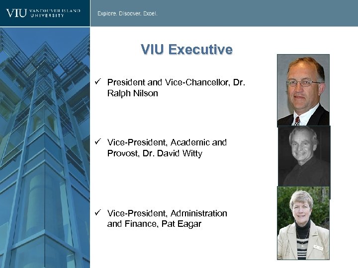 VIU Executive ü President and Vice-Chancellor, Dr. Ralph Nilson ü Vice-President, Academic and Provost, Dr. David Witty ü Vice-President, Administration and Finance, Pat Eagar