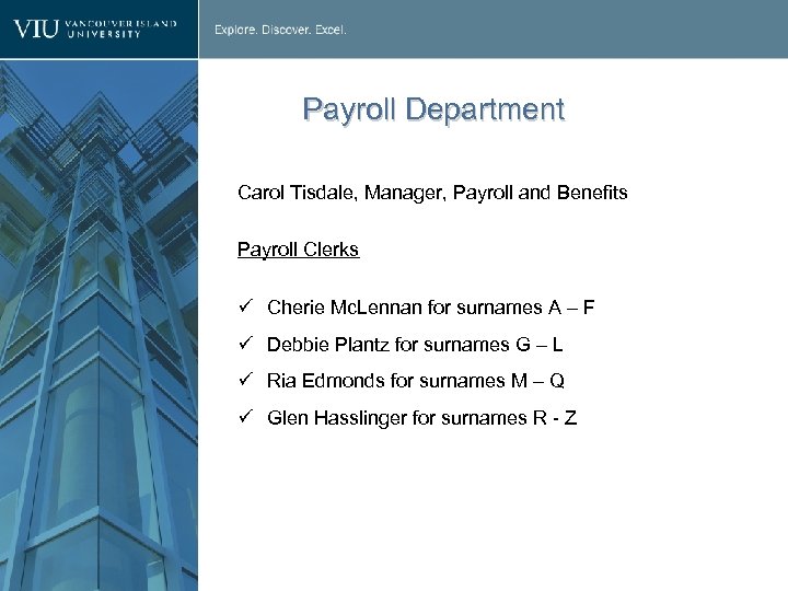 Payroll Department Carol Tisdale, Manager, Payroll and Benefits Payroll Clerks ü Cherie Mc. Lennan for surnames A – F ü Debbie Plantz for surnames G – L ü Ria Edmonds for surnames M – Q ü Glen Hasslinger for surnames R - Z
