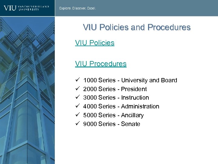 VIU Policies and Procedures VIU Policies VIU Procedures ü ü ü 1000 Series - University and Board 2000 Series - President 3000 Series - Instruction 4000 Series - Administration 5000 Series - Ancillary 9000 Series - Senate