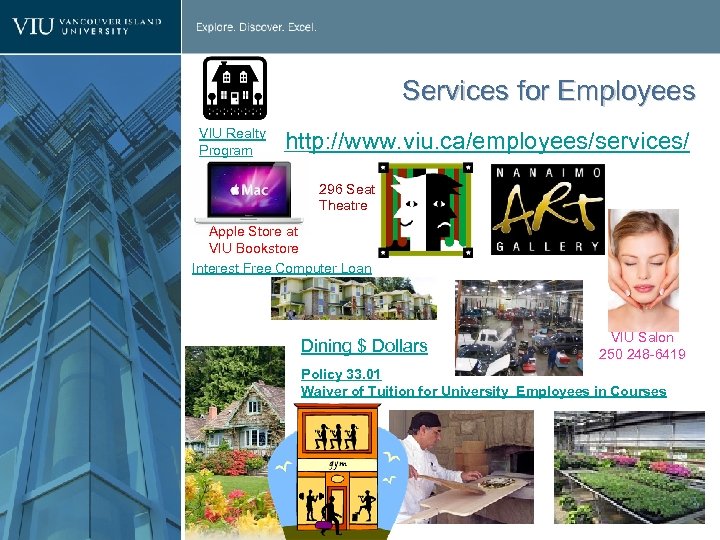 Services for Employees VIU Realty Program http: //www. viu. ca/employees/services/ 296 Seat Theatre Apple Store at VIU Bookstore Interest Free Computer Loan Dining $ Dollars VIU Salon 250 248 -6419 Policy 33. 01 Waiver of Tuition for University Employees in Courses