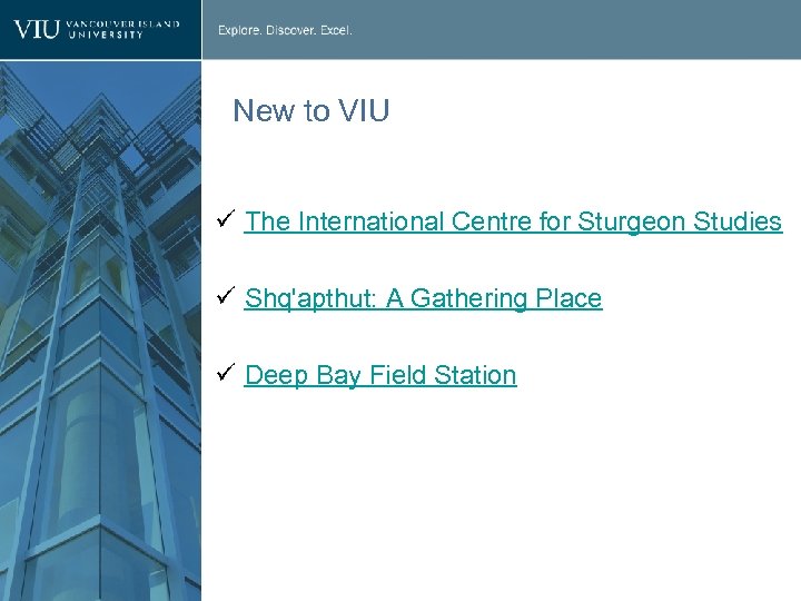 New to VIU ü The International Centre for Sturgeon Studies ü Shq'apthut: A Gathering Place ü Deep Bay Field Station
