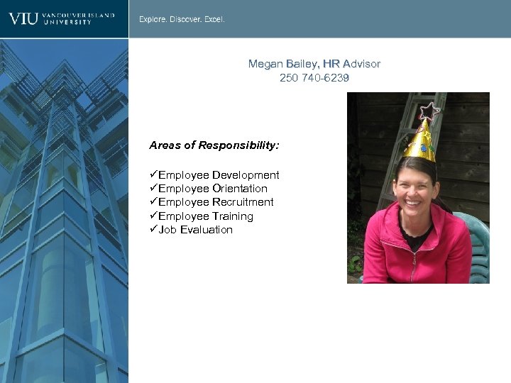 Megan Bailey, HR Advisor 250 740 -6239 Areas of Responsibility: üEmployee Development üEmployee Orientation üEmployee Recruitment üEmployee Training üJob Evaluation
