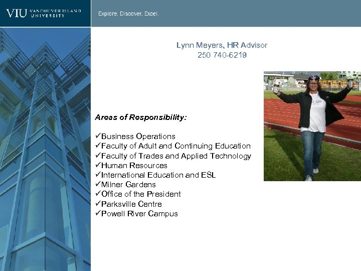Lynn Meyers, HR Advisor 250 740 -6219 Areas of Responsibility: üBusiness Operations üFaculty of Adult and Continuing Education üFaculty of Trades and Applied Technology üHuman Resources üInternational Education and ESL üMilner Gardens üOffice of the President üParksville Centre üPowell River Campus