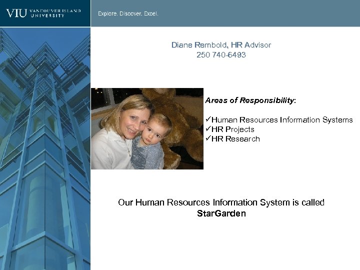 Diane Rembold, HR Advisor 250 740 -6493 Areas of Responsibility: üHuman Resources Information Systems üHR Projects üHR Research Our Human Resources Information System is called Star. Garden
