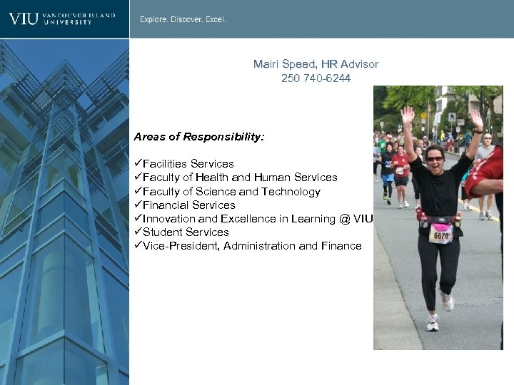 Mairi Speed, HR Advisor 250 740 -6244 Areas of Responsibility: üFacilities Services üFaculty of Health and Human Services üFaculty of Science and Technology üFinancial Services üInnovation and Excellence in Learning @ VIU üStudent Services üVice-President, Administration and Finance