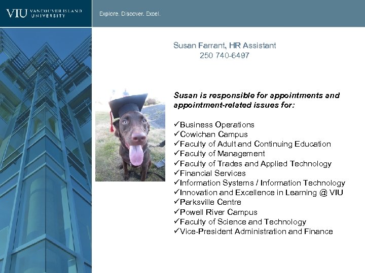 Susan Farrant, HR Assistant 250 740 -6497 Susan is responsible for appointments and appointment-related issues for: üBusiness Operations üCowichan Campus üFaculty of Adult and Continuing Education üFaculty of Management üFaculty of Trades and Applied Technology üFinancial Services üInformation Systems / Information Technology üInnovation and Excellence in Learning @ VIU üParksville Centre üPowell River Campus üFaculty of Science and Technology üVice-President Administration and Finance