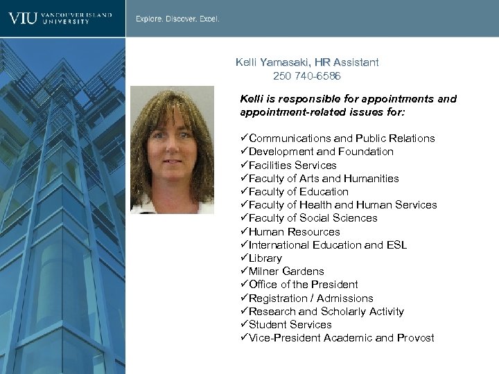 Kelli Yamasaki, HR Assistant 250 740 -6586 Kelli is responsible for appointments and appointment-related issues for: üCommunications and Public Relations üDevelopment and Foundation üFacilities Services üFaculty of Arts and Humanities üFaculty of Education üFaculty of Health and Human Services üFaculty of Social Sciences üHuman Resources üInternational Education and ESL üLibrary üMilner Gardens üOffice of the President üRegistration / Admissions üResearch and Scholarly Activity üStudent Services üVice-President Academic and Provost