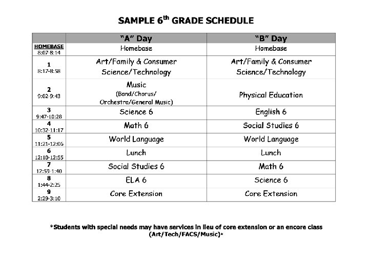 Encore Classes • • AIS Art Family & Consumer Sciences (FACS) Lunch-Time Enrichment Music (Band, Orchestra, Chorus and General Music) Pep 6 Physical Education Special Education Services (Speech, Counseling, Resource Room, OT, PT) • Technology • World Language (French, Italian, Latin, Spanish)