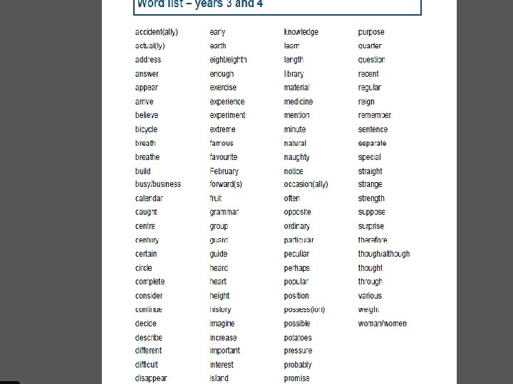 ARE Year 6: Writing Transcription and handwriting Spelling Vocabulary, grammar and punctuation Grammar Composition Planning 1. I can spell commonly mis-spelt words, including those from the Y 5/6 word list. 2. I can convert nouns or adjectives into verbs by adding a suffix eg –ate (popular-populate), -ise (familiar-familiarise), -ify (simple-simplify). 3. I can form verbs with prefixes. 4. I can use further prefixes and suffixes, understanding the rules for adding them. 5. I can spell some words with silent letters. 6. I can distinguish between homophones and other words which are often confused. 7. I can use knowledge of morphology and etymology to help me spell. 8. I can use the first 3 or 4 letters of a word to check spelling, meaning or both in a dictionary. 9. I can use a thesaurus. 10. I understand how words are related by meaning as synonyms and antonyms. Handwriting 11. I have legible, fluent, appropriately joined handwriting with increasing speed. 12. I can choose the style of handwriting to use when given a choice. 13. I can choose the handwriting implement that is best suited for a specific task. 14. I can start sentences in different ways, using openers and other ways. 15. I can use relative clauses with ‘which’, ‘who’, ‘where’, ‘when’, ‘that’, ‘whose’, or with an implied (ie omitted) relative pronoun. 16. I can use expanded noun phrases to convey complicated information concisely, to interest the reader. 17. I can recognise vocabulary and structures that are appropriate formal speech and writing eg ‘find out’ / ‘discover’; ‘ask for’ / ‘request’ (and begin to use these). 18. I can use verb phrases with effect eg to indicate a degree of possibility using adverbs (eg perhaps, surely) or modal verbs (eg might, should, will, must). 19. I can use passive verbs. Punctuation 20. I can use brackets, dashes or commas to indicate parenthesis. 21. I can use commas to mark phrases and clauses or to clarify meaning / avoid ambiguity. 22. I can use a colon to introduce a list. 23. I can use bullet points to list information and punctuate consistently. 24. I can use semi-colons, colons or dashes to mark boundaries between independent clauses. 25. I can use a semi-colon within lists. 26. I can use a hyphen to avoid ambiguity eg I saw a man-eating shark. 27. I can write for a specific audience and purpose. 28. I select the appropriate form and use other similar writing as a model, using appropriate features and sentence structure, considering the writer’s viewpoint, considering another author’s work. 29. I can plan and develop ideas, using reading / research where necessary. 30. I can organise my writing into paragraphs / sections to show changes in time, place and events or to shape a non-fiction text. Drafting and writing 31. I can describe settings, characters and atmosphere (mood) when writing narrative. 32. I can present text appropriately eg (sub-) headings, bullets, underlining, columns, tables. 33. I can build cohesion in my writing: between paragraphs (eg by using adverbials / connectives such as ‘After that, ’, ‘Firstly, ’) and between sentences (‘although’). 34. I can use vocabulary for effect. 35. I can use grammar for effect. 36. I can integrate dialogue for effect. 37. I can summarise a paragraph. 38. I can use appropriate nouns and pronouns within and across sentences for cohesion and avoid repetition, beginning to use ‘noun substitutes’. 39. I can distinguish language of speech (eg colloquial) and writing (Standard English), using formal and informal speech and structures appropriately (eg subjunctive forms [‘If I were…’] and question tags). Editing 40. I can assess and edit to improve my writing or another’s, to enhance effects and clarify meaning. 41. I can proof-read: spelling and punctuation; correct tense throughout; subject – verb agreement etc. Grammar and punctuation terminology active, passive subject, object hyphen antonym, synonym colon, semi-colon bullet points ellipsis _Use passive voice confidently eg suspense or in science report _Use range of sentence types for impact and specific effect _Control sentences, manipulating clauses for specific effects _Engage by eg personal comments, opening hook, flashback _Write paragraphs with different structures and lengths _Advance events in narrative writing using character, dialogue, action