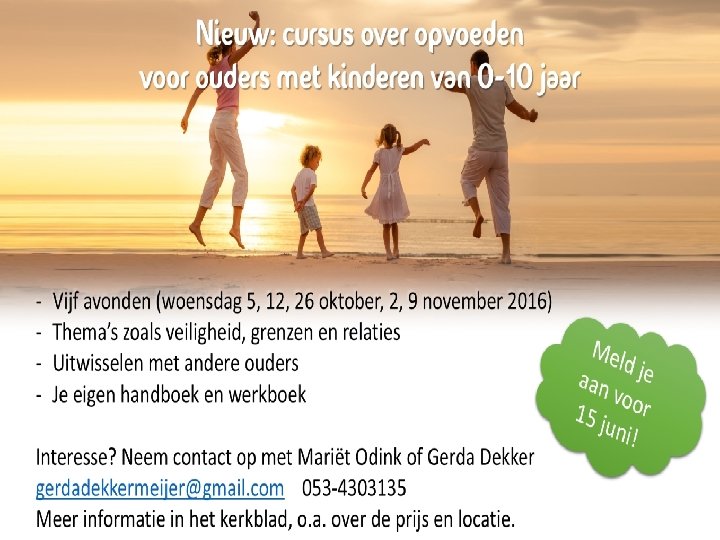 Kindernevendienst In de morgendienst is er gelegenheid voor de kinderen van 4 t/m 7 jaar om naar de kindernevendienst te gaan! Jullie zijn van harte welkom! Denken jullie ook aan het potje voor Red een Kind?