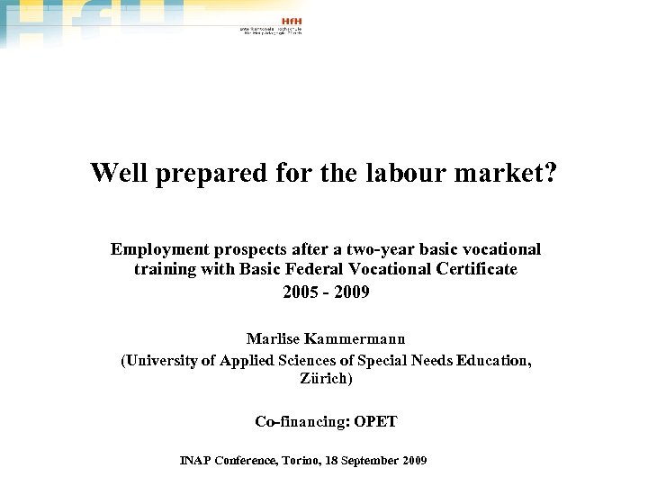 Well prepared for the labour market? Employment prospects after a two-year basic vocational training with Basic Federal Vocational Certificate 2005 - 2009 Marlise Kammermann (University of Applied Sciences of Special Needs Education, Zürich) Co-financing: OPET INAP Conference, Torino, 18 September 2009