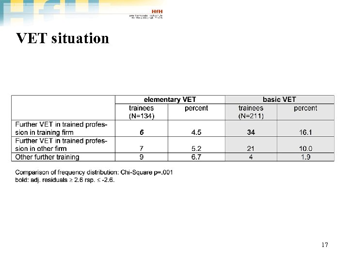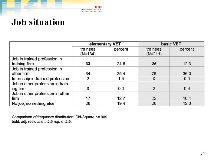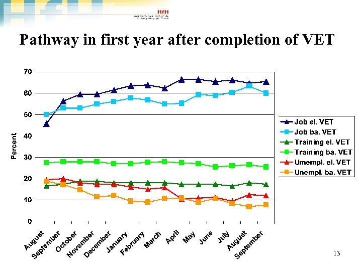 Professional situation one year after completion of VET (approximately 14 months after the end of training) elementary VET-trainees (N=134) Secure professional situation: 81% secure job : 64% VET : 10% Basic VET-trainees (N=211) Secure professional situation: 88% secure job : 60% VET: 26% Comparison of frequency distribution p <. 01 12