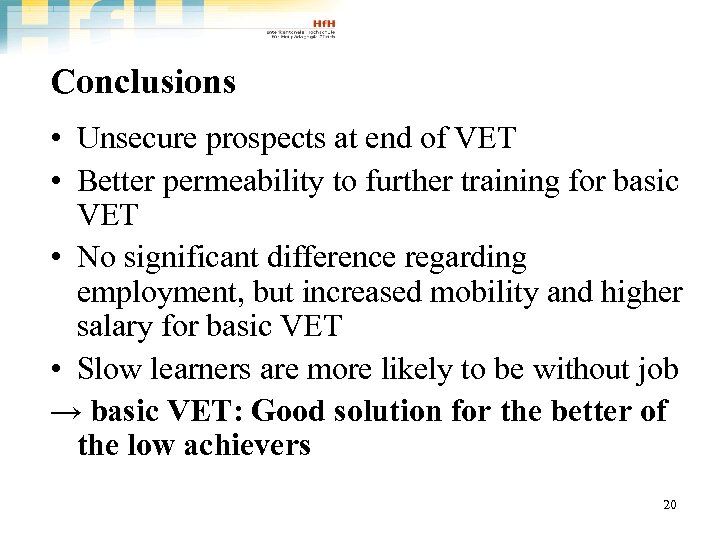 Conclusions • Unsecure prospects at end of VET • Better permeability to further training for basic VET • No significant difference regarding employment, but increased mobility and higher salary for basic VET • Slow learners are more likely to be without job → basic VET: Good solution for the better of the low achievers 20