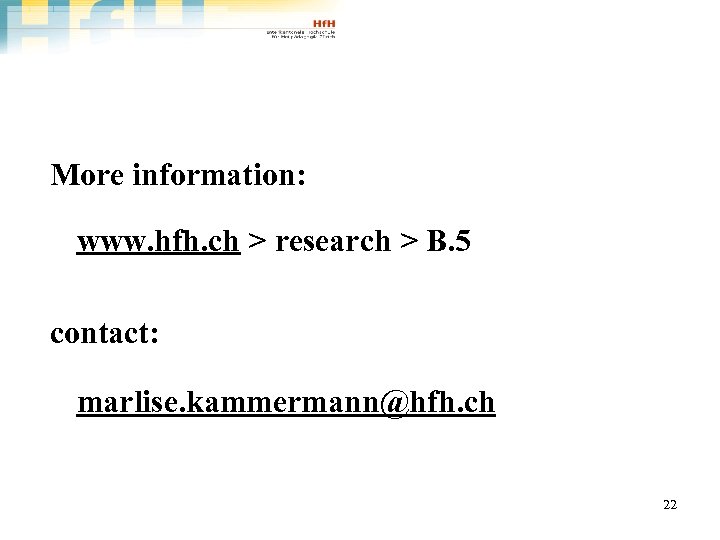 More information: www. hfh. ch > research > B. 5 contact: marlise. kammermann@hfh. ch 22