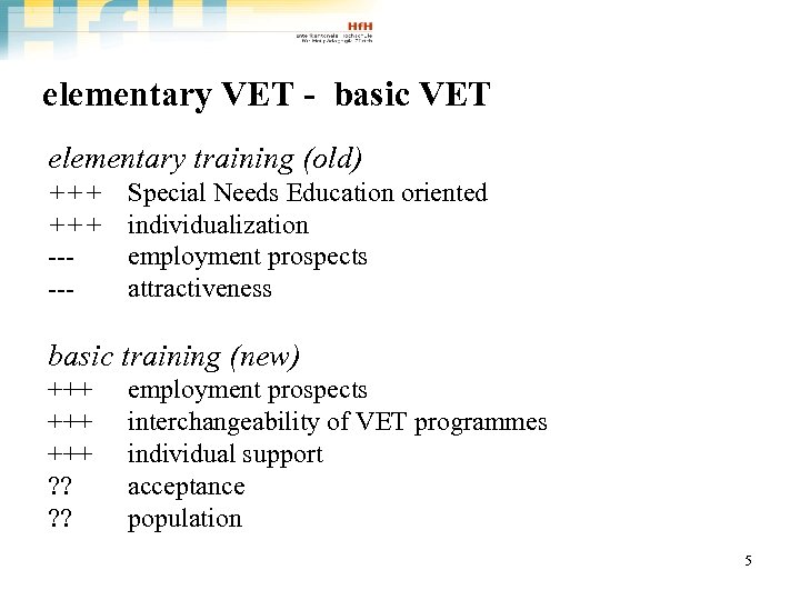 elementary VET - basic VET elementary training (old) +++ ----- Special Needs Education oriented individualization employment prospects attractiveness basic training (new) +++ +++ ? ? employment prospects interchangeability of VET programmes individual support acceptance population 5