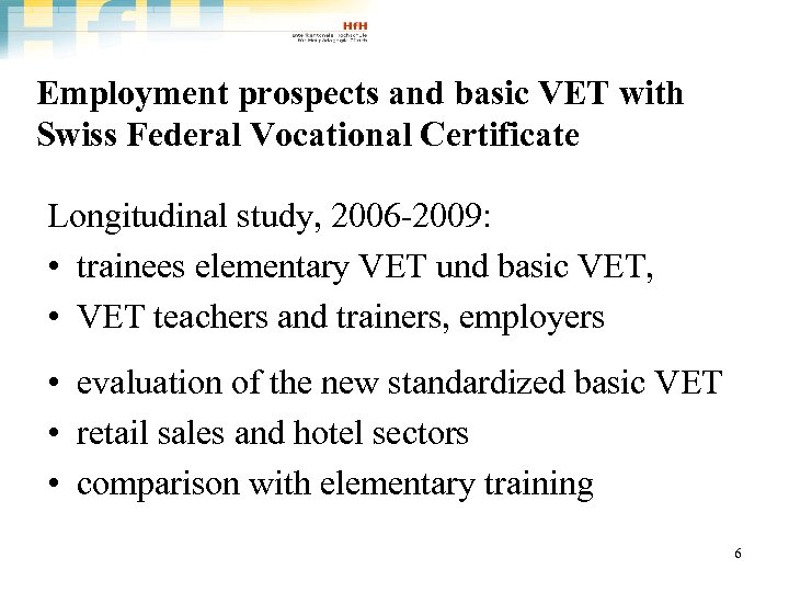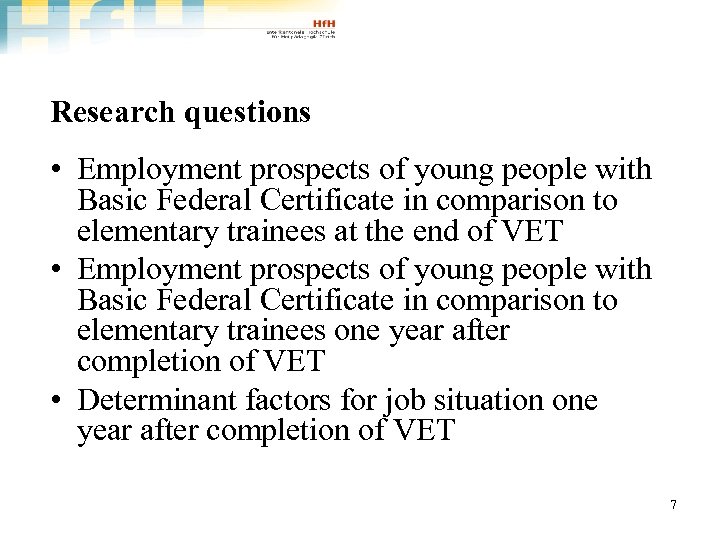 Employment prospects and basic VET with Swiss Federal Vocational Certificate Longitudinal study, 2006 -2009: • trainees elementary VET und basic VET, • VET teachers and trainers, employers • evaluation of the new standardized basic VET • retail sales and hotel sectors • comparison with elementary training 6
