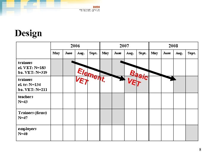 Design 2006 May trainees el. VET: N=183 ba. VET: N=319 trainees el. tr: N=134 ba. VET: N=211 June Aug. 2007 Sept. May Elem VET ent. June Aug. 2008 Sept. May June Aug. Sept. Bas i VET c teachers N=43 Trainers (firms) N=47 employers N=40 8