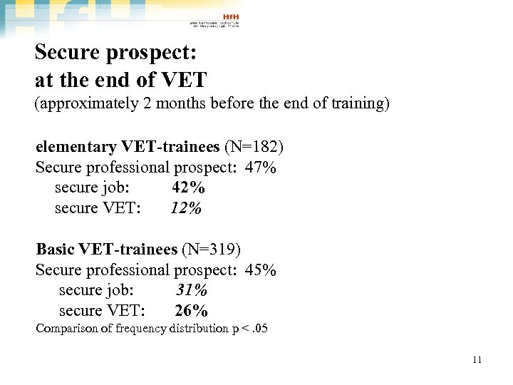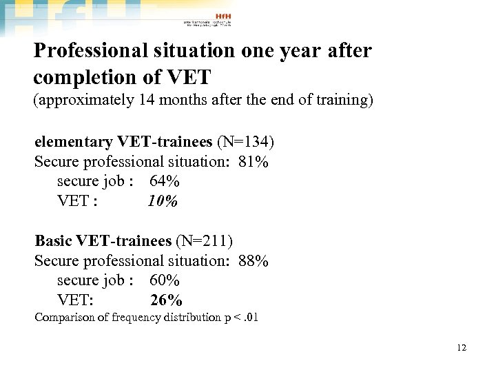 Secure prospect: at the end of VET (approximately 2 months before the end of training) elementary VET-trainees (N=182) Secure professional prospect: 47% secure job: 42% secure VET: 12% Basic VET-trainees (N=319) Secure professional prospect: 45% secure job: 31% secure VET: 26% Comparison of frequency distribution p <. 05 11