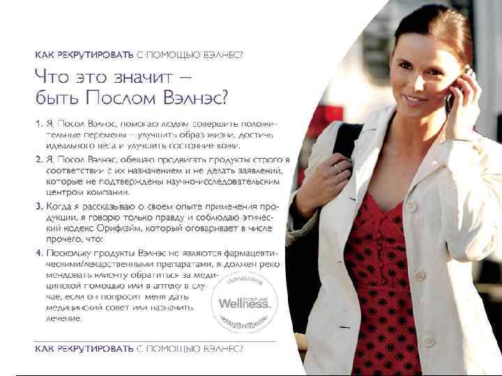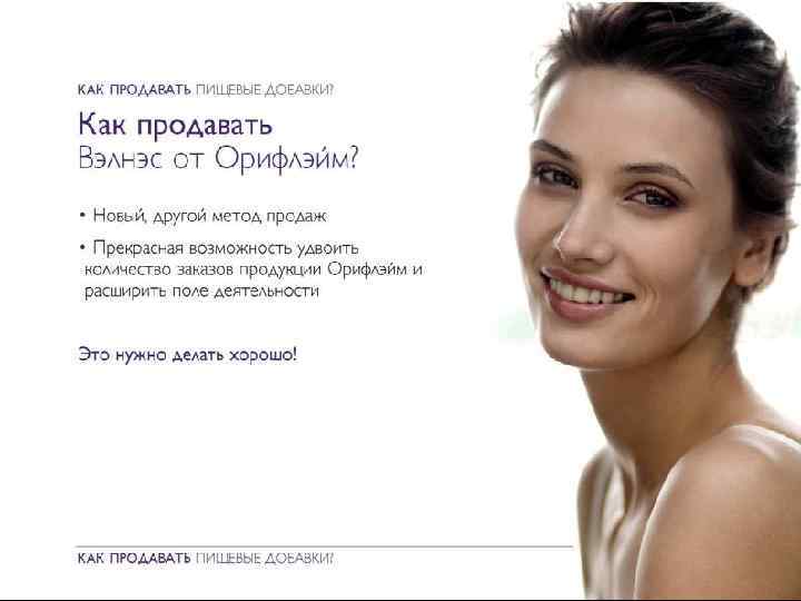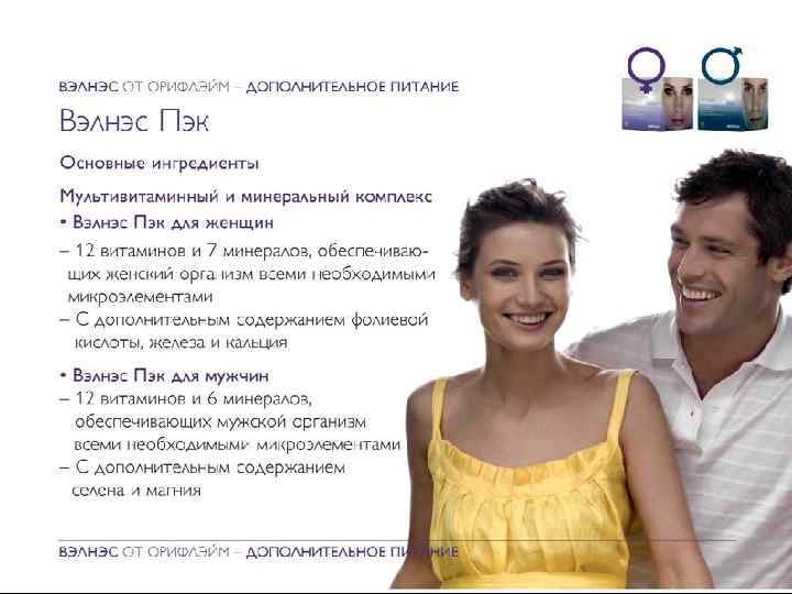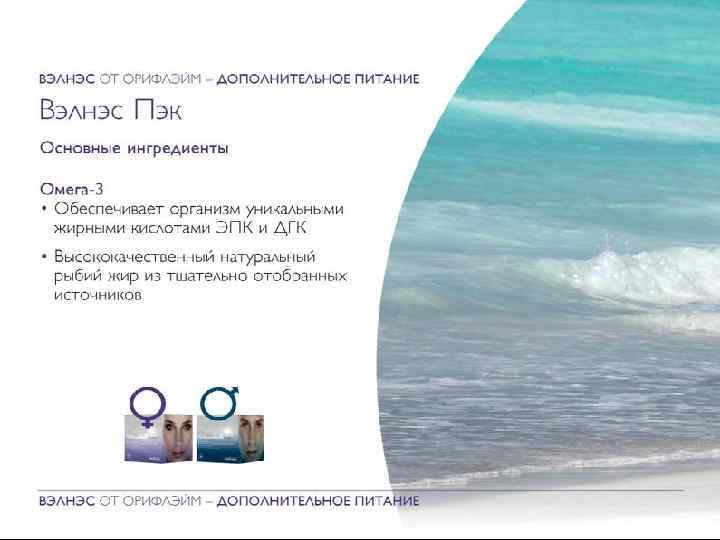 Вэлнэс Пэк Для всех программ включайте в свой рацион Вэлнэс Пэк для o Поддержания молодости и красоты • Улучшения выносливости • Отличного самочувствия и энергии Коктейль «Нэчурал Баланс» и Вэлнэс Пэк дополняют друга, обеспечивая организм полным комплексом ежедневно необходимых питательных веществ. Copyright © 2009 by Oriflame Cosmetics SA