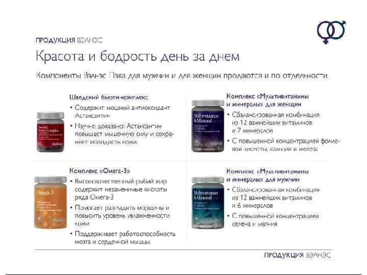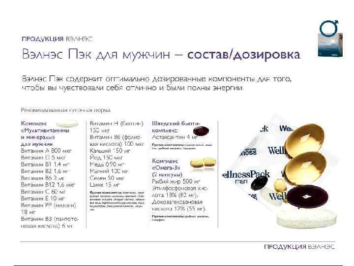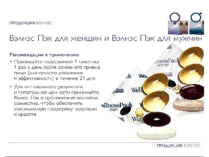 Wellness Pack для женщин и мужчин • Обеспечивает ежедневную потребность организма в витаминах, минералах и других питательных веществах – для долгой здоровой жизни и энергии каждый день • Улучшает внешний вид кожи, питая, увлажняя и разглаживая ее изнутри • Повышает мышечную силу и выносливость