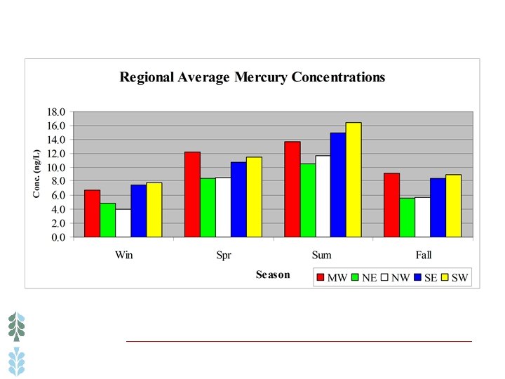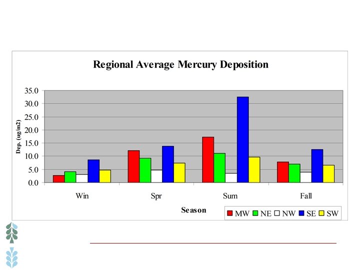 Possible Reasons for High Mercury Deposition in the Summer o o o Higher rainfall amounts Higher temperatures Higher oxidant levels Southerly air flow Strong thunderstorms Higher emissions (ocean)