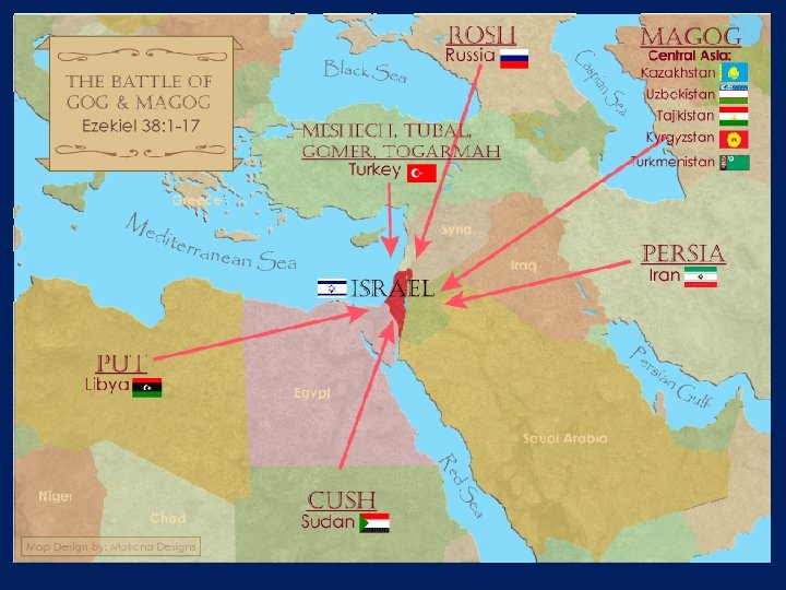 Ancient Names From Ezekiel 38: 1 -9 1. Magog (Central Asia), 2. Rosh (Russia), 3. Meshec (Turkey), 4. Tubal (Turkey), 5. Persia (Iran), 6. Put (Libya), 7. Cush (Sudan), 8. Gomer (Turkey), 9. Togarmah (Turkey)