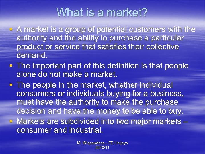 What is a market? § A market is a group of potential customers with the authority and the ability to purchase a particular product or service that satisfies their collective demand. § The important part of this definition is that people alone do not make a market. § The people in the market, whether individual consumers or individuals buying for a business, must have the authority to make the purchase decision and have the money to be able to buy. § Markets are subdivided into two major markets – consumer and industrial. M. Wispandono - FE Unijoyo 2010/11
