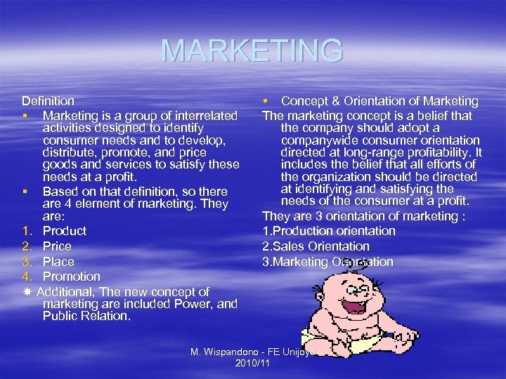 MARKETING Definition § Marketing is a group of interrelated activities designed to identify consumer needs and to develop, distribute, promote, and price goods and services to satisfy these needs at a profit. § Based on that definition, so there are 4 element of marketing. They are: 1. Product 2. Price 3. Place 4. Promotion Additional, The new concept of marketing are included Power, and Public Relation. § Concept & Orientation of Marketing The marketing concept is a belief that the company should adopt a companywide consumer orientation directed at long-range profitability. It includes the belief that all efforts of the organization should be directed at identifying and satisfying the needs of the consumer at a profit. They are 3 orientation of marketing : 1. Production orientation 2. Sales Orientation 3. Marketing Orientation M. Wispandono - FE Unijoyo 2010/11