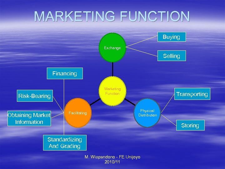 MARKETING FUNCTION Buying Exchange Selling Financing Marketing Function Risk-Bearing Obtaining Market Information Facilitating Transporting Physical Distribution Storing Standardizing And Grading M. Wispandono - FE Unijoyo 2010/11