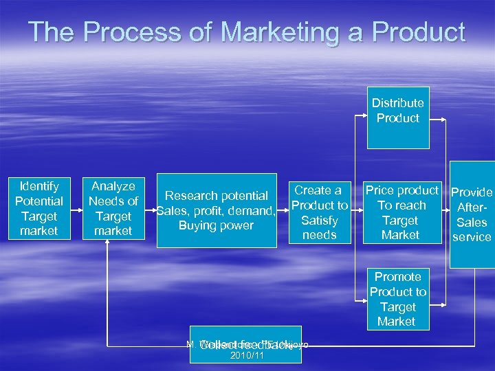 The Process of Marketing a Product Distribute Product Identify Potential Target market Analyze Needs of Target market Research potential Sales, profit, demand, Buying power Create a Product to Satisfy needs Price product To reach Target Market Promote Product to Target Market M. Wispandono - FE Unijoyo Collect feedback 2010/11 Provide After. Sales service