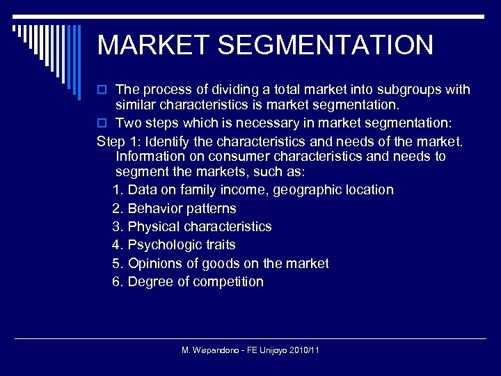MARKET SEGMENTATION o The process of dividing a total market into subgroups with similar characteristics is market segmentation. o Two steps which is necessary in market segmentation: Step 1: Identify the characteristics and needs of the market. Information on consumer characteristics and needs to segment the markets, such as: 1. Data on family income, geographic location 2. Behavior patterns 3. Physical characteristics 4. Psychologic traits 5. Opinions of goods on the market 6. Degree of competition M. Wispandono - FE Unijoyo 2010/11