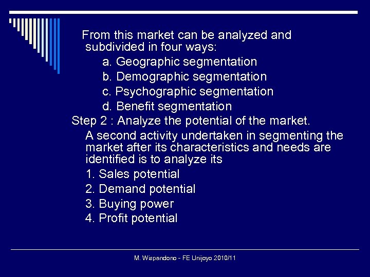 From this market can be analyzed and subdivided in four ways: a. Geographic segmentation b. Demographic segmentation c. Psychographic segmentation d. Benefit segmentation Step 2 : Analyze the potential of the market. A second activity undertaken in segmenting the market after its characteristics and needs are identified is to analyze its 1. Sales potential 2. Demand potential 3. Buying power 4. Profit potential M. Wispandono - FE Unijoyo 2010/11