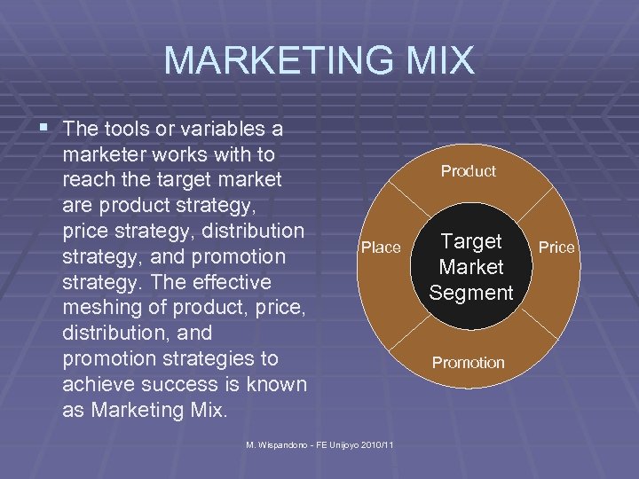 MARKETING MIX § The tools or variables a marketer works with to reach the target market are product strategy, price strategy, distribution strategy, and promotion strategy. The effective meshing of product, price, distribution, and promotion strategies to achieve success is known as Marketing Mix. Product Place M. Wispandono - FE Unijoyo 2010/11 Target Market Segment Promotion Price