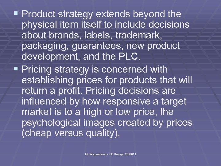 § Product strategy extends beyond the physical item itself to include decisions about brands, labels, trademark, packaging, guarantees, new product development, and the PLC. § Pricing strategy is concerned with establishing prices for products that will return a profit. Pricing decisions are influenced by how responsive a target market is to a high or low price, the psychological images created by prices (cheap versus quality). M. Wispandono - FE Unijoyo 2010/11