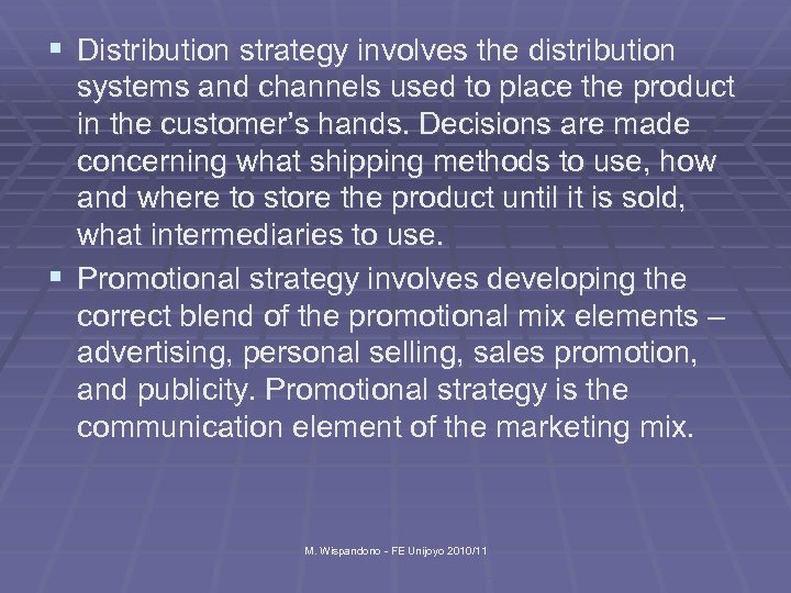 § Distribution strategy involves the distribution systems and channels used to place the product in the customer’s hands. Decisions are made concerning what shipping methods to use, how and where to store the product until it is sold, what intermediaries to use. § Promotional strategy involves developing the correct blend of the promotional mix elements – advertising, personal selling, sales promotion, and publicity. Promotional strategy is the communication element of the marketing mix. M. Wispandono - FE Unijoyo 2010/11